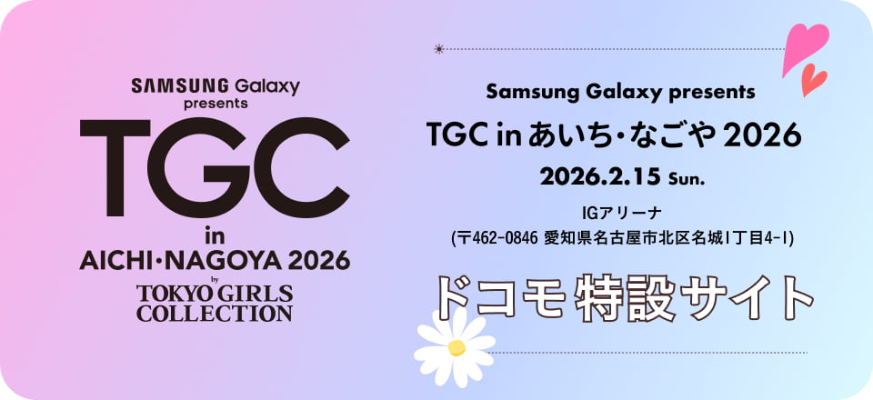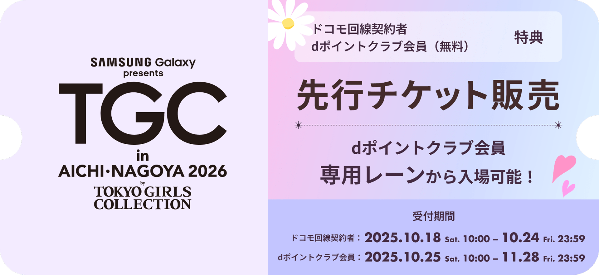 Samsung Galaxy presents TGC in あいち・なごや 2026 ドコモ回線契約者先行(先着) 2025年10月18日(土)10:00~10月24日(金)23:59 dポイントクラブ会員限定先行(先着) 2025年10月25日(土)10:00~2025年11月28日(金)23:59