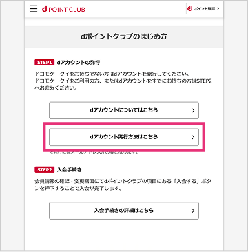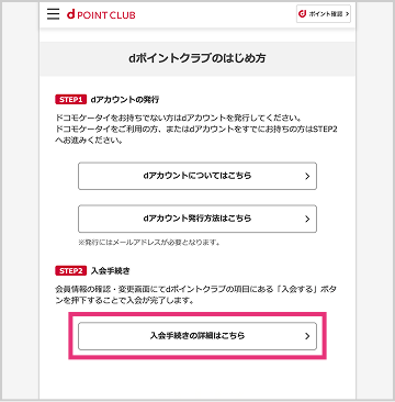 dアカウント登録完了後、「STEP2 入会手続きの詳細はこちら」にてdポイントクラブ会員の登録を行う