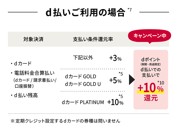 d払いをご利用の場合、定期クレジット設定しているdカード GOLD U/dカード GOLD/dカード PLATINUMとは別のdカード GOLD U/dカード GOLD/dカード PLATINUMに対しご利用携帯電話番号登録いただいた場合でも、dカード GOLD U/dカード GOLDは5.0%、dカード PLATINUMは10.0%の進呈率を適用します。