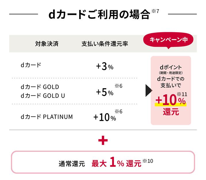 対象決済がdカード GOLD U/dカード GOLD/dカード PLATINUMの場合、対象決済の利用日の23:59時点で、ご利用携帯電話番号として登録した、本料金プランを契約している回線の利用料金をdカード/dカード GOLD U/dカード GOLD/dカード PLATINUMで支払う設定をしている必要があります。対象決済がd払いの場合、決済時点で本料金プランを契約している回線の料金プランをdカード/dカード GOLD U/dカード GOLD/dカード PLATINUMで支払う設定をしていることに加え、ご利用のdカード GOLD U/dカード GOLD/dカード PLATINUMに本料金プランを契約している回線のご利用携帯電話番号登録の設定をしている必要があります。