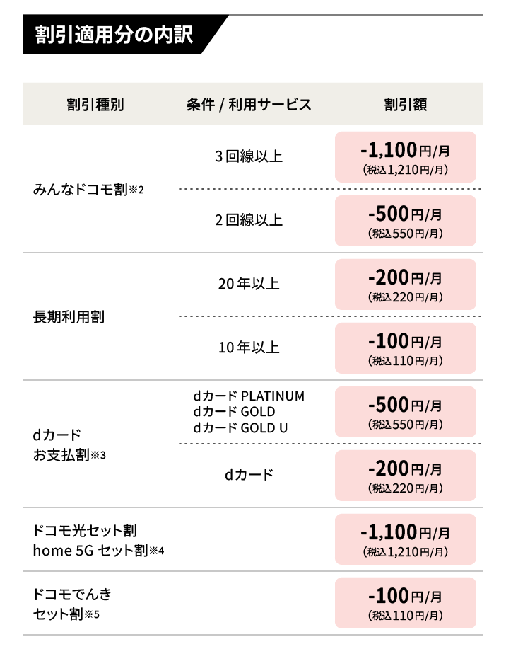 「ドコモ光」または「home 5G プラン」契約者と同一「ファミリー割引」グループ内の「ドコモ MAX」「ドコモ ポイ活 MAX」「ドコモ ポイ活 20」「ドコモ mini」の契約者が対象です。また、適用には「ドコモ光」または「home 5G プラン」のご契約が必要となり、別途「ドコモ光」または「home 5G」の月額費用がかかります。(「ドコモ光」の場合、プロバイダ込・1ギガ・解約金(戸建:5,500円(税込)/マンション:4,180円(税込))有で2年定期契約の場合月4,400円(税込)~5,940円(税込)。「home 5G プラン」の場合、月4,950円(税込)(※2025年7月以降5,280円)と別途HR01/HR02のご購入が必要)。