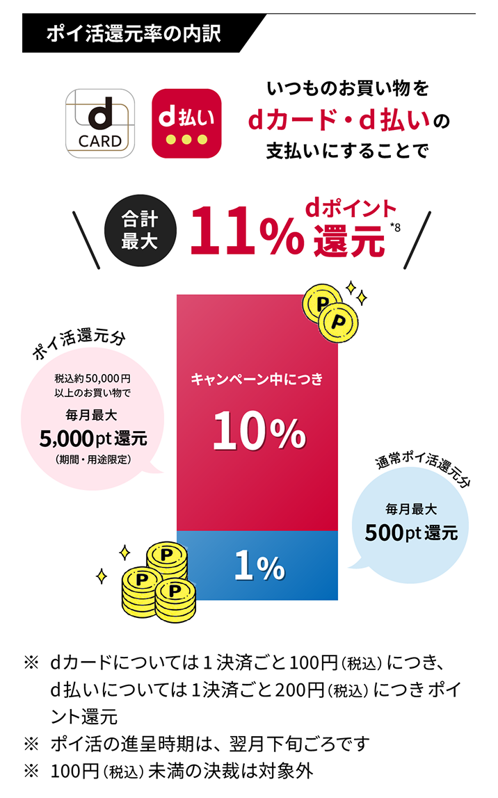 - 税込約50,000円※以上のお買物でゲットしたdポイント(期間・用途限定)の上限5,000ポイント(通常還元は別途500ポイント進呈)※ポイントの進呈時期は翌月下旬ごろです ※100円(税込)未満の決済は対象外