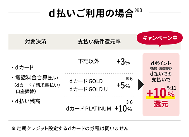 • d払いをご利用の場合、定期クレジット設定しているdカード GOLD U/dカード GOLD/dカード PLATINUMとは別のdカード GOLD U/dカード GOLD/dカード PLATINUMに対しご利用携帯電話番号登録いただいた場合でも、dカード GOLD U/dカード GOLDは5.0%、dカード PLATINUMは10.0%の進呈率を適用します。