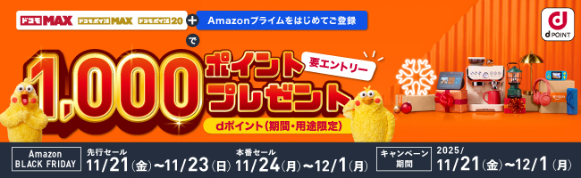 - ※Amazonプライム会費・電子書籍等の対象外商品有、ドコモ経由Amazonプライム&回線契約(*1は対象プランに限る)の両方が決済時に有効な場合が対象。詳細はこちら。