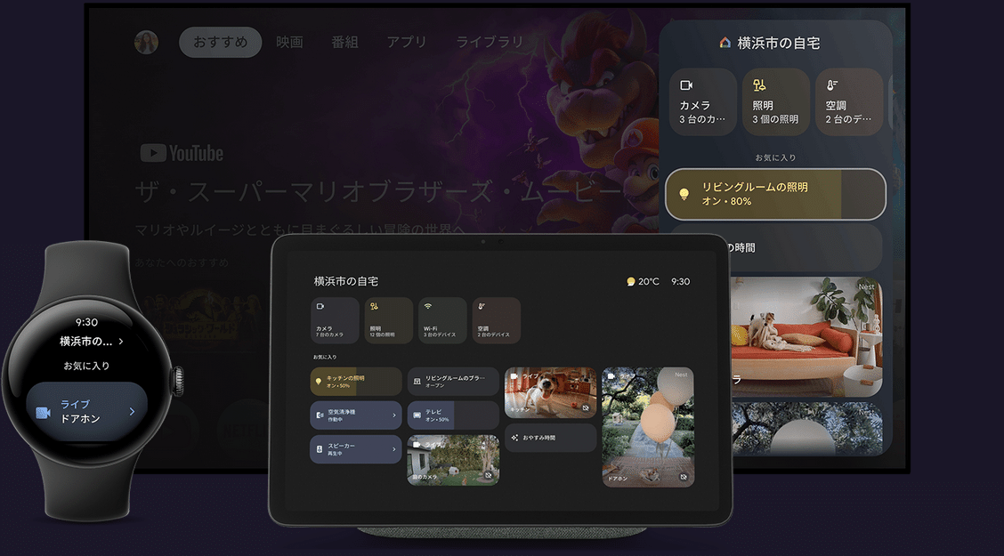 ※Google Homeのご利用には、対応するスマートデバイスが必要です。お使いになれるスマートホームの自動化機能は、イン ターネットや Wi-Fi の環境、Google および自動化機能の対象デバイスを製造しているサードパーティが提供するサービスによって異なり、追加の登録と設定が必要です。
