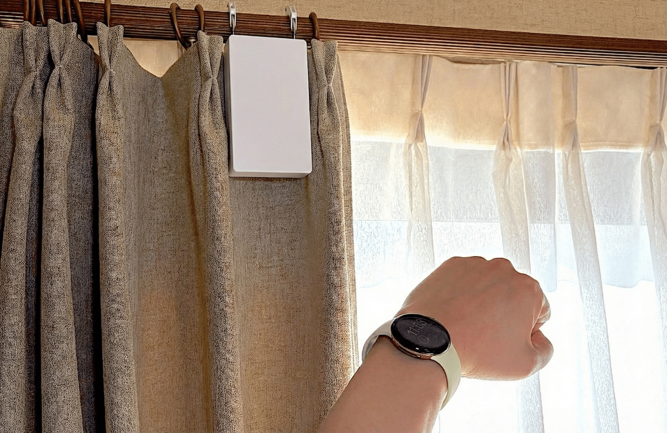 実際に「Google Pixel Watch 4」対応のスマートカーテンを使って、操作の指示を出してみます。まずスマートカーテンの公式アプリと「Google Home」を連携させてからスマートウォッチに向かって「カーテンを開けて」と話しかけると、カーテンレールに取り付けたガジェットがレールに沿って移動を開始。自動でゆっくりと開いていくカーテンを見るとなんだか感動します。