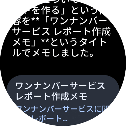 スマートウォッチから「Gemini」を呼び出したら、残したいメモの文章をしゃべったあと、最後に「~というのをメモに残して」と付けてみましょう。すると自動で「Google keep」に連携して「文章をメモに残しておきました」と対応してくれます。