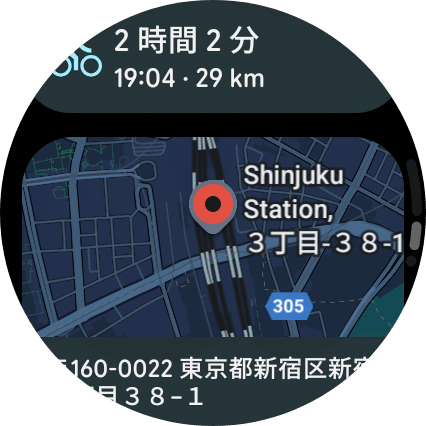 目的地までの道順を確認したいときにも「Gemini」は役立ちます。「〇〇駅までの道を教えて」と問いかければ、現在地から目的地までの移動手段や所要時間、移動距離、マップ表示などをすぐに提示してくれます。スマートウォッチの画面で確認すれば迷わず目的地まで移動できるのが嬉しいですね。
