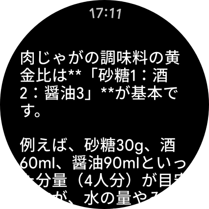 キッチンで調理をするときに、これまでは完成形の料理を調べて、調味料をチェックして…とやっていた手順も、スマートウォッチなら簡単に知ることができます。