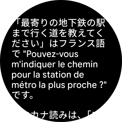 「『最寄りの地下鉄の駅まで行く道を教えてください』、をフランス語で言ってください」と頼めば、即座にスマートウォッチの画面にフランス語の文章が表示され、同時に音声で読み上げてくれます。その文章の読み仮名としてカタカナ表記も出るので、それを見ながら自分で話すことも可能。