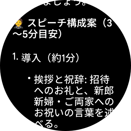 スマートウォッチの「Gemini」を起動したら、そこに作りたい文章のテーマとアイデアを伝えてみましょう。例えば「おすすめのスマートフォンをまとめたレポートを考えて」と伝えると、ものの数秒でスマートウォッチの画面にレポートの企画案が表示されます。まるで優秀なアシスタントがサポートしてくれるように、どんどんとアイデアを出してくれるのはまさにAIならではの優れたポイントですね。