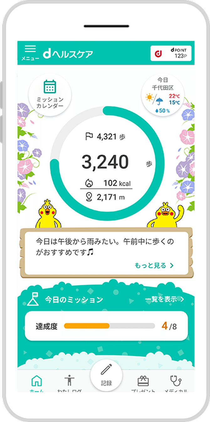 dヘルスケアは、NTTドコモが提供するスマートフォン向けの健康管理アプリです。歩数や体重、血圧などの記録や、健康に関するミッションの達成でdポイントが貯まります。